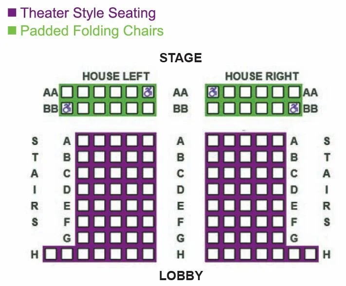 Green seats denote the folding chairs. Purple seats denote the permanent theatrical seats.